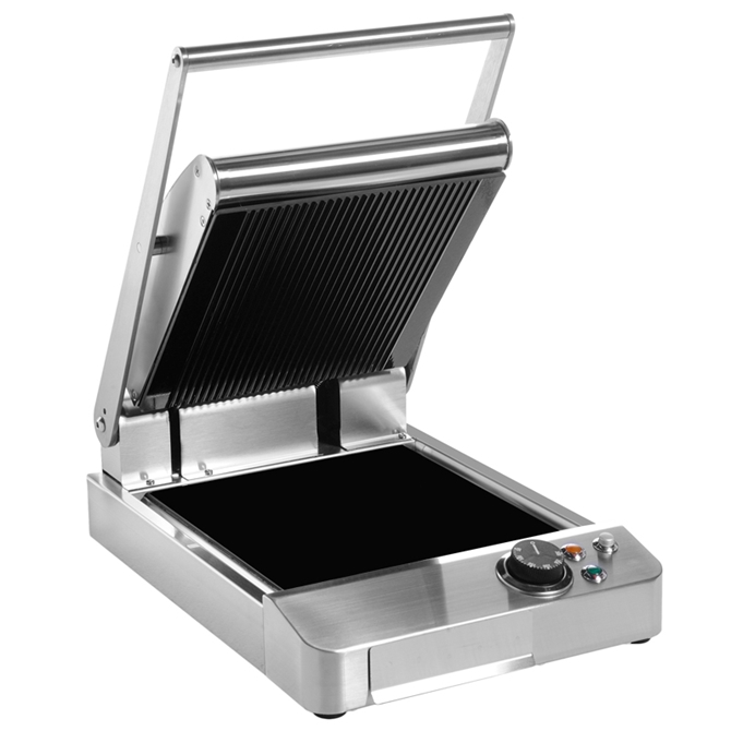Piastra elettrica singola o doppia linea snack TPPD, TPPS La linea di piastre TECNOFOOD in vetroceramica, con la sua estrema praticità di utilizzo e i risultati di cottura eccellenti, è perfetta per la ristorazione veloce e può essere un valido supporto anche in cucina. Rivestimento esterno in acciaio inox con bordi arrotondati per la massima pulizia e igiene, cottura a contatto con temperatura regolabile fino a 300°C, piano in vetroceramica inferiore liscio e superiore rigato. Marchio CE. Dimensioni: 310/610x466x517 mm 1,5/3KW AC220-240V/50Hz 0° - 300°C |